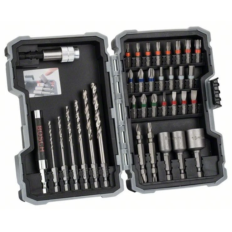 Das 35-teilige Set mit Extra-Hart-Schrauberbits ist eine gute Wahl für allgemeine Arbeiten. Komplettes Set mit Zubehör für wesentliche Bohr- und Schraubarbeiten Schrauberbits aus S2-modifiziertem Stahl, optimierter Wärmebehandlungsprozess, überdurchschnittliche Härte, starke Leistung Die konische Torsionszone der Bits verarbeitet gut Drehmomentspitzen, da sie beim Schrauben Kräfte und Schwingungen aufnimmt. Alle Bits sind für schnelle Übersicht und Identifizierung des richtigen Bittyps farbcodiert. Darüber hinaus enthält das Set präzisionsgearbeitete Bohrer aus HSS-Stahl für hohe Bohrraten in Metall und Kunststoff. Sie besitzen einen Außensechskantschaft der Größe 1/4-Zoll für Schraubendreher und Bohrschrauber. Darüber hinaus enthält das Set präzisionsgearbeitete Bohrer aus HSS-Stahl für hohe Bohrraten in Metall und Kunststoff. Es besitzt einen Außensechskantschaft der Größe 1/4-Zoll für allgemeine Schraubarbeiten mit Schraubendrehern und Bohrschraubern. Das 35-teilige Set mit Extra Hart-Schrauberbits präsentiert sich in einer praktischen und robusten Staubox, die sowohl guten Überblick als auch sichere Lagerung und Transport ermöglicht. Das Set enthält: PH1, PH2, PH3 PZ1, PZ2, PZ3 S 3/4/5/6 H3, H4, H5, H6 T10, T15, T20 (2x), T25, T27, T30, T40 Steckschlüssel 8/10/13 mm HSS-G 2.5/3.0/3.5/4.0/5.0/6.0 mm Bits mit Doppelklinge PH2/PZ2 Bits mit Doppelklinge Th20/Th25 Das Set besteht aus Bits unterschiedlicher Länge und Art für verschiedene Schraubentypen und Steckschlüssel für Sechskantschrauben. Auch enthalten ist ein Universalmagnethalter und ein Universalhalter mit Schnellwechselfunktion.