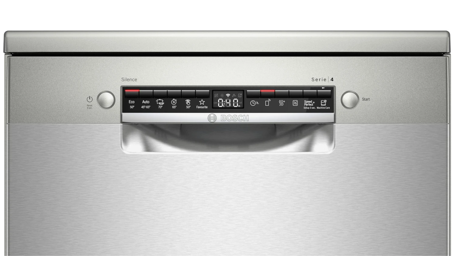 Bosch Serie 4 SMS4HTI31E. Geräteplatzierung: Freistehend, Produktgröße: Standardgröße (60 cm), Türfarbe: Edelstahl. Anzahl Maßgedecke: 12 Maßgedecke, Lärmemissionsklasse: C, Geräuschpegel: 46 dB. Höhenverstellbare Füße: 2 cm. Energieeffizienzklasse: E, Wasserverbrauch pro Zyklus: 9,5 l, Energieverbrauch für 100 Zyklen: 92 kWh. Breite: 600 mm, Tiefe: 600 mm, Höhe: 845 mm