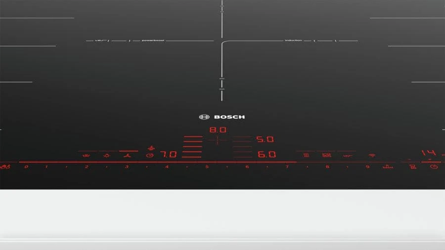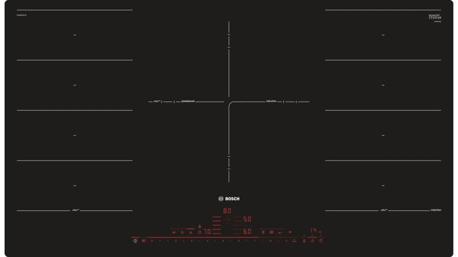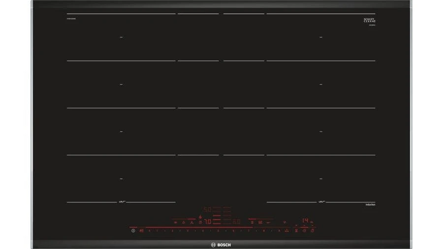 Bosch Serie 8 PXV901DV1E. Produktfarbe: Schwarz, Geräteplatzierung: Integriert, Kochfeldtyp: Zonen-Induktionskochfeld. Schmorplatte/ Kochzone: 2200 W, Standard Herdplatte/Kochzone: 2600 W, Große Herdplatte/Kochzone: 3300 W. Steuerung: Berührung, Steuerungsposition: Vorne oben, Timer-Typ: Digital. Anschlusswert (elektrisch): 11100 W, AC Eingangsspannung: 220-240 V, AC Eingangsfrequenz: 50 – 60 Hz. Breite: 892 mm, Tiefe: 512 mm, Höhe: 56 mm