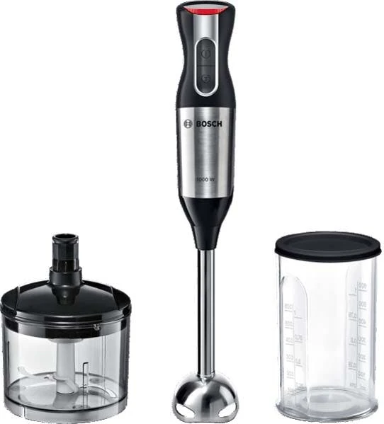 Ergonomisch geformt, große Tasten, Soft-Touch-Gehäuse, zusätzliche Turbotaste, Edelstahl-Mixfuß, Eject-Mechanismus, Mixfuß und Messbecher (mit Skalkerung) sind spülmaschinengeeignet, Farbe: Rot/weiß